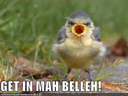 "Food food food food food food. ALERT! (my hand goes it) STRANGE FIVE-HEADED WORM ATTACKING!(I retreat) Food food food food food food. ALERT! (my hand with nest) STRANGE FIVE-HEADED WORM ATTACKING!
